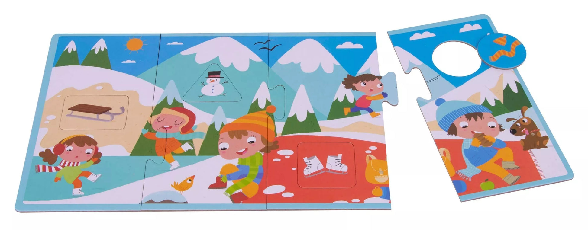 Ši smagi pažinimo dėlionė padės lavinti smulkiąją motoriką, dėmesio koncentravimą ir supažindins su skirtingais metų laikais.