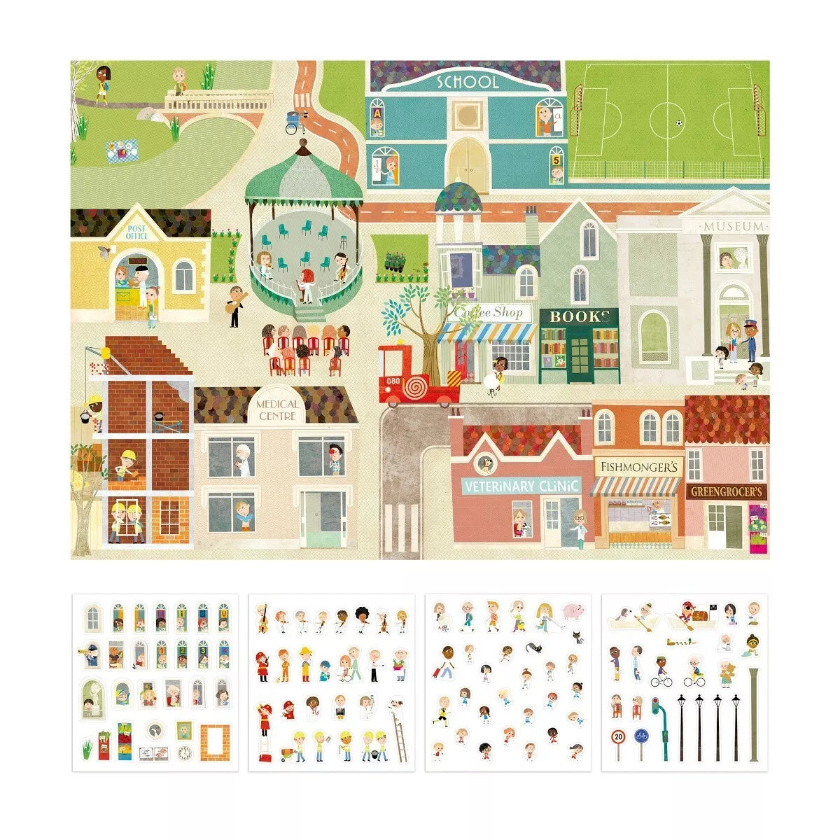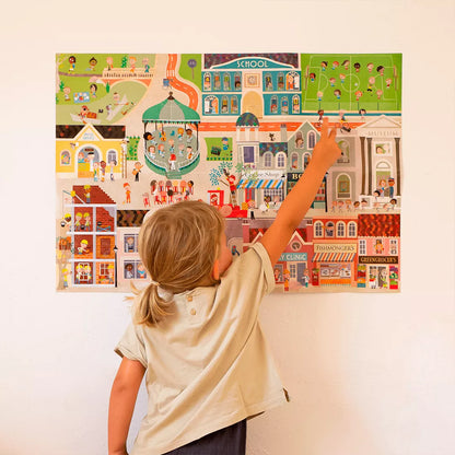 Didelis plakatas su daugkartiniais lipdukais vaizduoja miesto gyvenimą. Užpildykite plakatą smagiais daugkartiniais lipdukais ir kurkite savo miestą su istorija! Žaidimas su lipdukais yra pagrindinė veikla, leidžianti vaikams lavinti smulkiuosius motorinius įgūdžius ir įvairius pažintinius gebėjimus. Plakate vaizduojami objektai, daiktai, augalai ir žmonės skatina spalvų pažinimą, pildo vaiko žodžių žodyną bei skatina žaisti vaidmenų žaidimus, ugdo kūrybingumą. Pildydami plakatą kartu su draugais, vaikai mokosi bendrauti bei palaukti savo eilės taip lavindami socialinius įgūdžius.