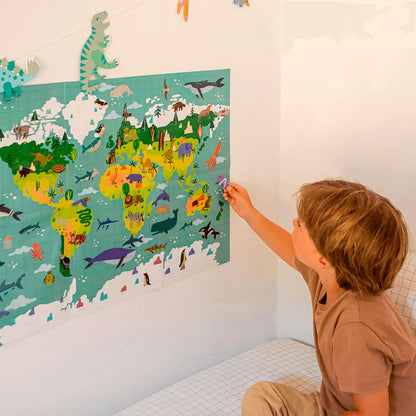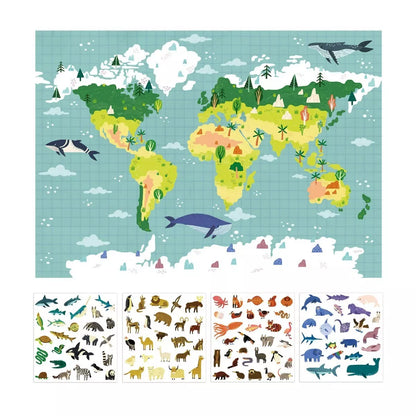 Didelis plakatas su daugkartiniais lipdukais vaizduoja viso pasaulio žemynus. Užpildykite plakatą smagiais daugkartiniais lipdukais ir užpildykite žemynus gyvybe! Žaidimas su lipdukais yra pagrindinė veikla, leidžianti vaikams lavinti smulkiuosius motorinius įgūdžius ir įvairius pažintinius gebėjimus. Plakate vaizduojami objektai, augalai ir gyvūnai skatina spalvų pažinimą, pildo vaiko žodžių žodyną, supažindina su pasauliu ir jame gyvenančiais gyvūnais bei skatina žaisti vaidmenų žaidimus, ugdo kūrybingumą. Pildydami plakatą kartu su draugais, vaikai mokosi bendrauti bei palaukti savo eilės taip lavindami socialinius įgūdžius.