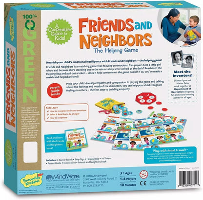 „Friends and Neighbors” yra derinimo ir atitikimo žaidimas, orientuotas į emocijas. Ar žaidėjai sugebės padėti mažai mergaitei, kuri liūdi, nes stovi lauke lietuje, arba berniukui, bijančiam būti tamsoje? Įkiškite ranką į „Pagalbos” maišelį ir ištraukite žetoną - ar jis gali padėti kam nors ant žaidimo lentos? Jei taip - turite porą! Žaisdami žaidimą ir skaitydami apie personažų jausmus ir poreikius, tėvai gali padėti savo vaikams atpažinti jausmus kituose ir taip padėti žengti pirmą žingsnelį empatijos link.