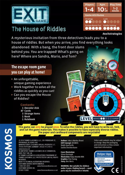 Jūs ir jūsų kolegos niekada nepaliekate neišspręstų paslapčių. Būtent dėl šios priežasties atsidūrėte šiame apleistame name. Staiga jūs išgirstate riksmą ir matote, kad už jūsų užsidarė išėjimo durys. Dabar jūs neturite pasirinkimo. Ar jums pavyks išspręsti bylą ir rasti išėjimą iš šio namo? EXIT galvosūkiai puikiai suderina logiką ir kritinį mąstymą. Šis žaidimas gali būti žaidžiamas tik vieną kartą, kadangi reikia žymėti, lankstyti ir plėšyti žaidimo priemones norint išspręsti mįsles, sutaisyti lėktuvą ir jį saugiai nutupdyti.