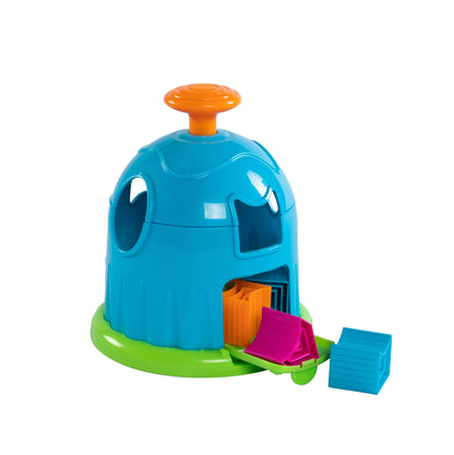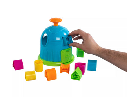 Formų rūšiavimas su smagiu ir mąstymą lavinančiu posūkiu! Rinkinyje yra dešimt unikalių figūrų ir keturios angos. Ar sugebėsite išsiaiškinti, kaip sutalpinti VISAS formas per angas? Štai, kaip tai veikia: su mygtuko paspaudimu, viršus pasisuka ir visos angos pasikeičia vietomis. Vaikai turi tyrinėti ir eksperimentuoti norėdami išspręsti šią mįslę ir pritaikyti angas visoms figūroms. Pavyko? Puiku! Metas atidaryti dureles, išleisti visus blokelius ir vėl pradėti visą smagumą iš pradžių. Skatina erdvinį mąstymą, smulkiosios motorikos įgūdžius, problemų sprendimo gebėjimus, eksperimentavimą.