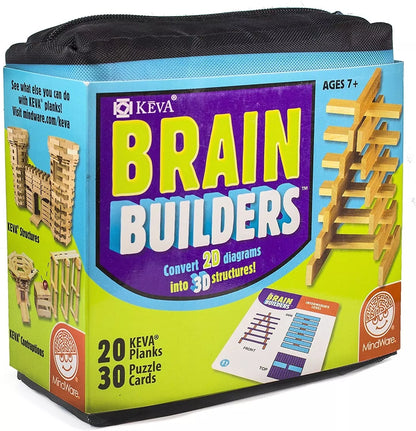 Pažvelkite į KEVA visiškai kitu kampu su šiuo interaktyviu STEM įrankiu! Brain Builders sujungia 20 KEVA lentelių su mąstymą stimuliuojančių galvosūkių kortelių rinkiniu. Kiekviena kortelė turi 2D iššūkį ant vienos pusės ir jo sprendimą ant kitos pusės. Jūsų tikslas yra atkurti 2D konstrukcijas ir paversti jas 3D struktūromis. 2D kortelės parodo dizainą iš skirtingų kampų, pabrėžiant priekį, šoną ir vaizdą iš viršaus bei su kiekviena vis sudėtingėja nuo pradinuko iki eksperto. Manipuliuokite KEVA lentelėmis ir sėkmingai atkurkite balansą, proporciją, kompoziciją ir geometriją, pavaizduotą ant kiekvienos kortelės. Kai nusprendžiate, jog išsprendėte šį techninį piešinį, apverskite kortelę ir patikrinkite sprendimą - pasistenkite atsilaikyti pagundai žvilgtelėti į jį anksčiau laiko. Kiekvienam iššūkiui tampant vis sudėtingesniam, bandant, klystant ir bandant vėl įgyjama kantrybė bei pasitikėjimas savimi. Nuo pikniko stalų ir plaustų iki gulbių ir gyvačių, būsite nustebinti, ką Jūsų smegenys gali sukurti! Tad pasitikrinkite savo 3D vaizduotės gebėjimus ir sustiprinkite STEM, smulkiosios motorikos, strateginius, fizikos ir inžinerijos pagrindų įgūdžius.