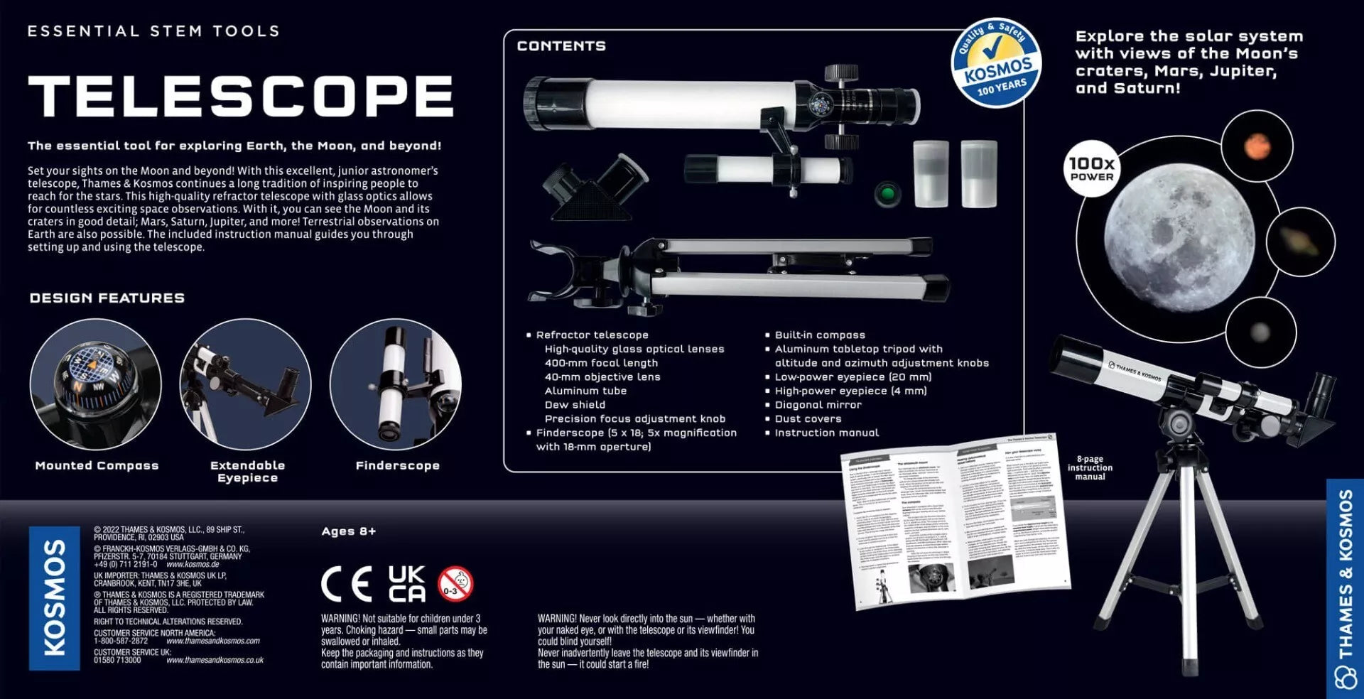 Nukreipkite savo žvilgsnį į Mėnulį ir už jo ribų! Su šiuo puikiu pradedančiųjų lygio teleskopu „Thames & Kosmos“ tęsia ilgametę tradiciją įkvėpti žmones siekti žvaigždžių. Tai aukštos kokybės refraktorinis teleskopas su stikline optika , leidžiantis atlikti daugybę jaudinančių kosmoso stebėjimų.