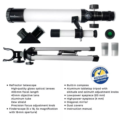 Aukštos kokybės optika: šis refraktorinis teleskopas turi aukštos kokybės stiklo optinius lęšius , 400 mm židinio nuotolį ir 40 mm objektyvo lęšį.