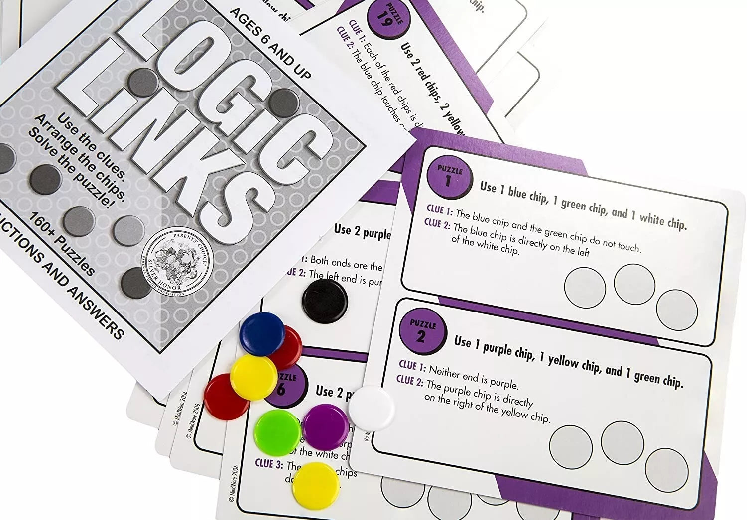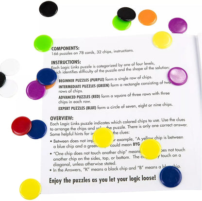Kiekvienas „Logic Links” galvosūkis panaudoja užuominų seriją taip suteikdamas žaidėjui instrukcijas, kur padėti spalvotus žetonus norint išspręsti iššūkį, reikalaujantį dedukcinio samprotavimo ir ryžto! Turėsite išmokti, kaip mąstyti atgal, į šonus, į kairę ir dešinę, aukštyn-žemyn skaitydami instrukcijas, kurios nuves jus prie vieno ir vienintelio teisingo atsakymo. Įjunkite loginį mąstymą ir mėgaukitės galvosūkiais! Šis žaidimas - tai puikus būdas pagerinti erdvinį suvokimą ir dedukcinio samprotavimo įgūdžius tuo pačiu metu mėgaujantis smagiu procesu! Jis tinka tiek individualiam, tiek komandiniam žaidimui - surenkite lenktynes ir išsiaiškinkite, kiek galvosūkių galite užbaigti per tam tikrą laiką arba rungtyniaukite, kas pirmasis sugebės įveikti galvosūkį.
