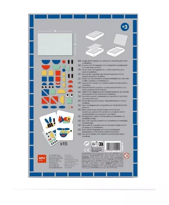 Magnetukai lengvai prisitvirtina prie specialios scenos, o 15 spalvingų pavyzdžių įkvepia žaisti ir eksperimentuoti. Galima dėlioti vieną ant kitos, maišyti spalvas, keisti formas – čia nėra taisyklių, tik begalinė kūryba ir džiaugsmas.