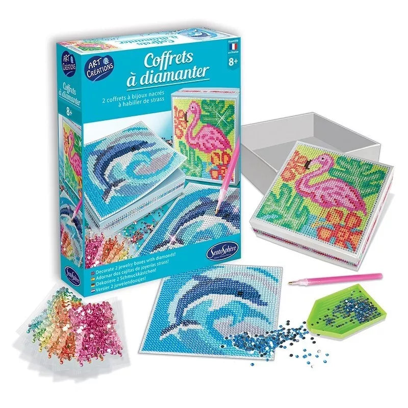 Su šiuo kūrybiniu rinkiniu, sukurkite dvi gražias papuošalų dėžutes, papuoštas egzotinių gyvūnų dizainais. Siūloma technika yra panaši į pikselių meną ir leidžia įvairaus amžiaus artistams sukurti gražius ir įmantrius meno kūrinius. Su kiekvienu pridėtu deimančiuku, iliustracijos atsiskleidžia mirguliuojančiomis ir gyvomis spalvomis.