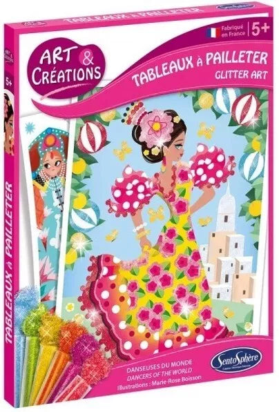 Spalvotais blizgučiais išdekoruokite šias nepaprastas pasaulio šokėjas ir sukurkite prabangius, blizgančius piešinius! Šį kūrybinį rinkinį sudaro dvi suklijuotos lentelės su iliustracijomis, kurias galėsite papuošti įvairiaspalviais blizgučiais. Pamatę rezultatą vaikai bus tikrai įkvėpti kurti.