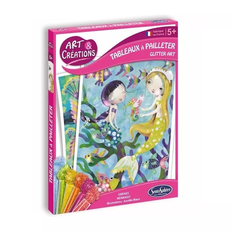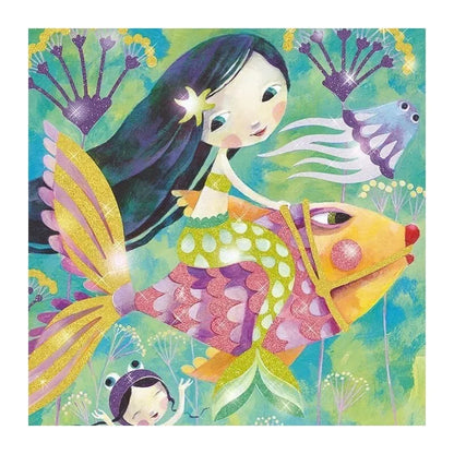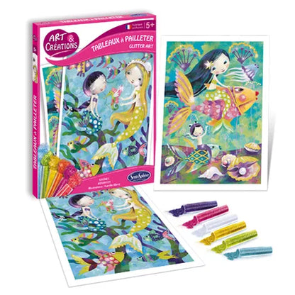Leiskite šioms dviems undinėlių iliustracijoms suspindėti blizgučiais bei grąžinkite jų pelekams žvilgesį! Dėžutėje yra du jau paruošti paveikslėliai, kuriuos gali papuošti taip, kaip Jums patinka, naudodami įvairiaspalvius blizgučius. Rezultatas tikrai paskatins vaikus būti kūrybingus.