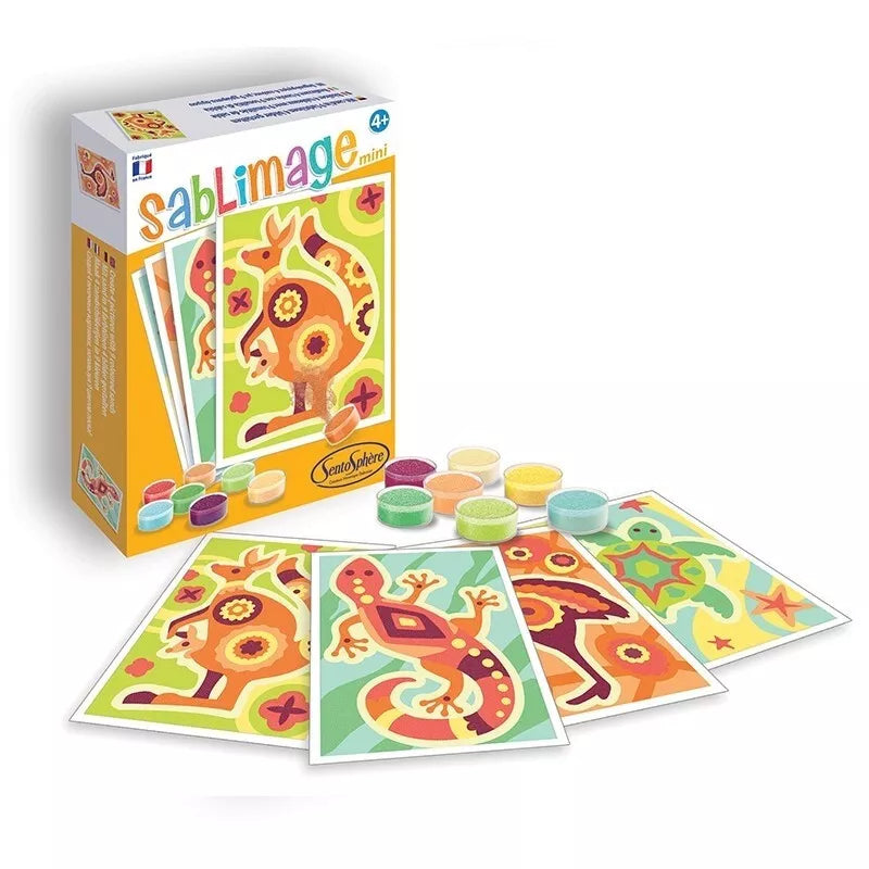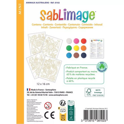Mėgaukitės šiuo mini rinkiniu, kad sukurtumėte keturis smėlio meno šedevrus! Naudodami pridėtas 9 smėlio spalvas, smagiai spalvinkite ir suteikite tekstūros šiems Australijos gyvūnams.