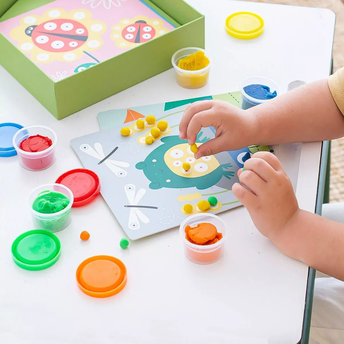 Rinkinį itin lengva naudoti: laminuotose kortelėse yra baltos vietos su spalvotais taškeliais, kurias vaikai gali užpildyt plastelino rutuliukais.