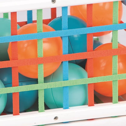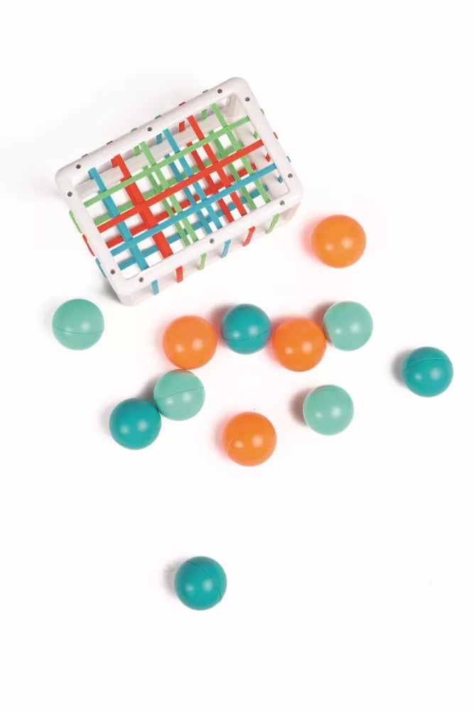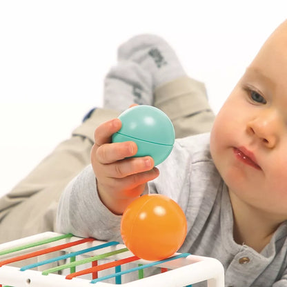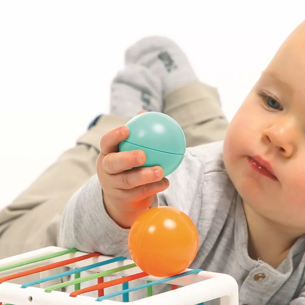 Kubo sienelės sudarytos iš elastinių juostelių. Dėliojant kamuoliukus, juostelės sudaro iššūkį mažyliui.