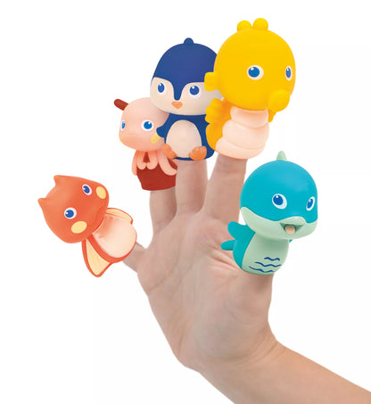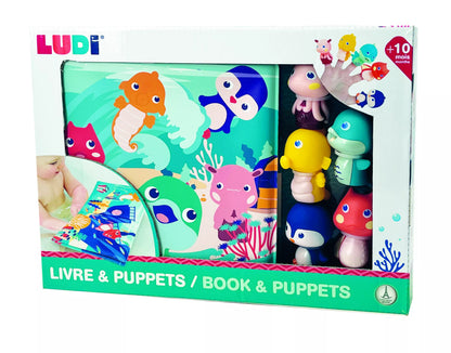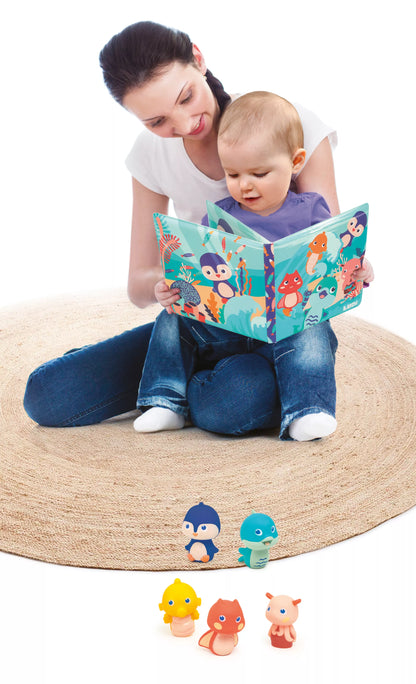 Maudymosi knygelė su mielais gyvūnėliais, kuriuos galima užsidėti ant pirščiukų.