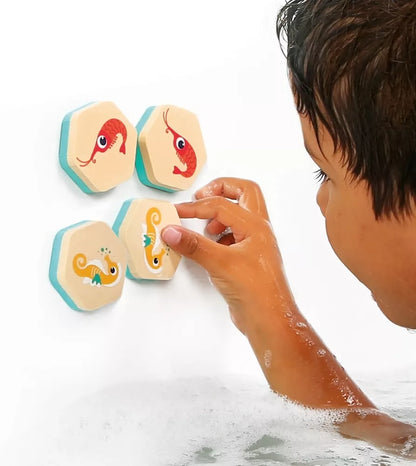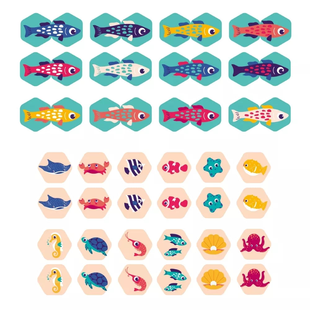24 dvipusės atminties kortelės su jūros gyvūnais. Mėlynosios kortelės pusės yra mini dėlionės - sudėjus dvi korteles susidaro viena žuvis. Smėlinė pusė - atminties žaidimas su jūros gyvūnais.