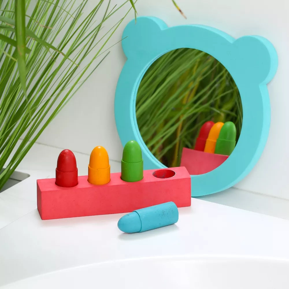 Rinkinyje yra veidrodėlis (20 cm), 4 kreidelės (ø2,5x7 cm) ir specialus kreidelių laikiklis.