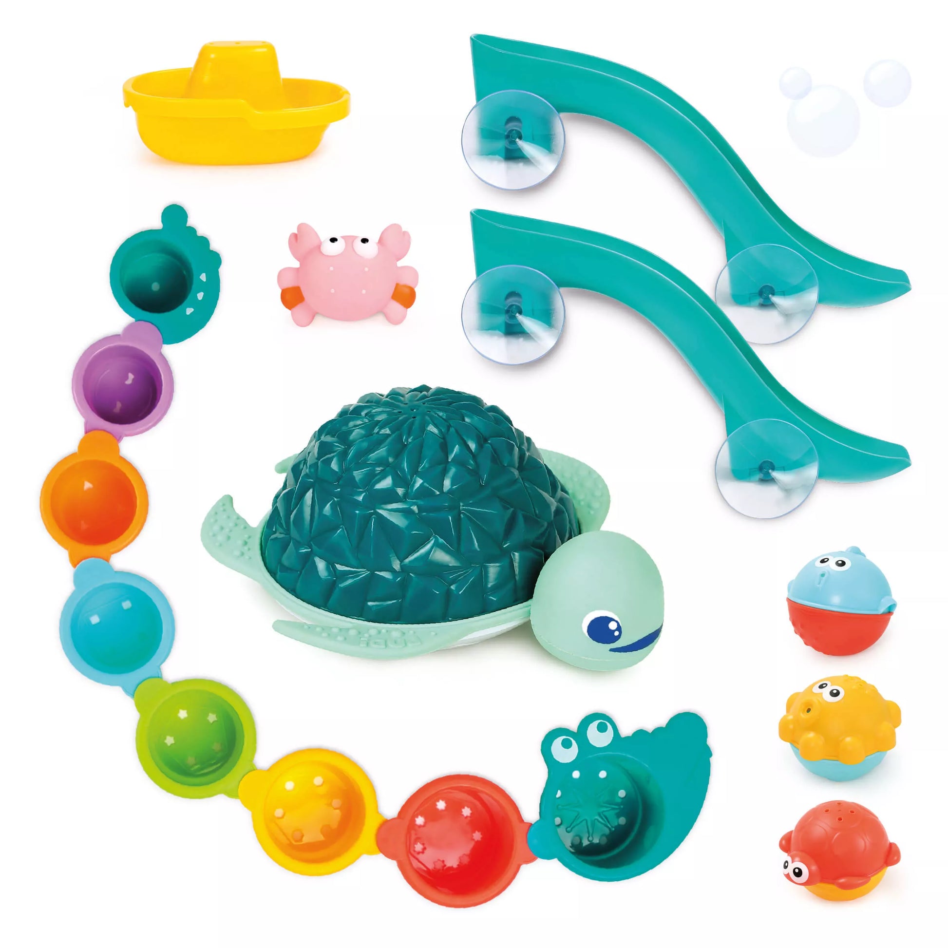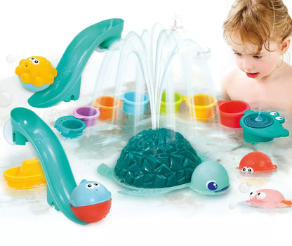 - 1 vėžlys - fontanas. Padėtas į vandenį šis mielas vėžliukas ima šviesti ir purkšti per nugarėlę vandenį. Žaislui reikalingos 3 x 1.5V LR03 (AAA) baterijos (į rinkinį neįeina).