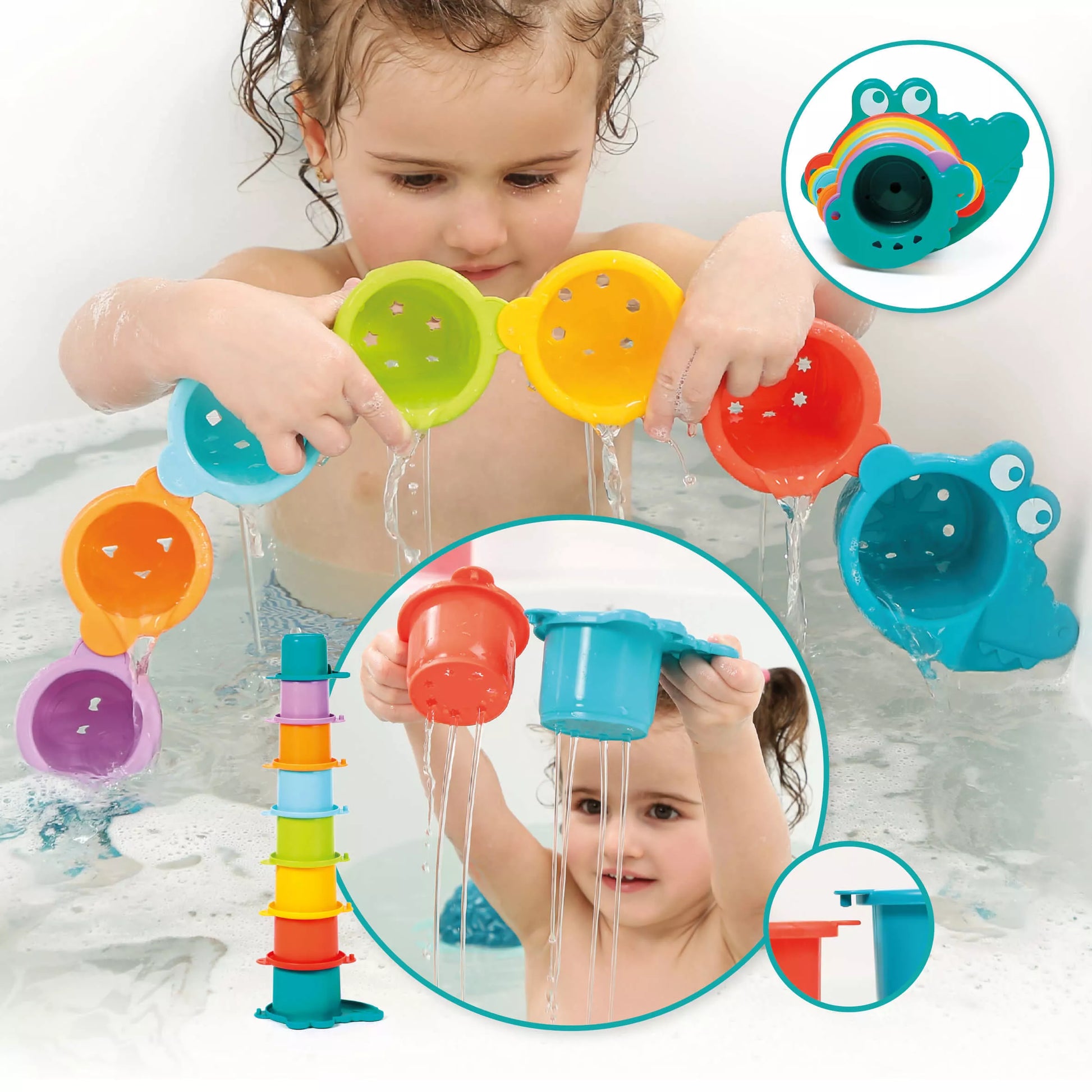 - 8 puodeliai - krokodilas. Visų puodelių apačioje yra unikalios angos vandeniui pilstyti, juos galima sudėti vieną į kitą arba sujungti šonais ir taip sudėlioti krokodilą!