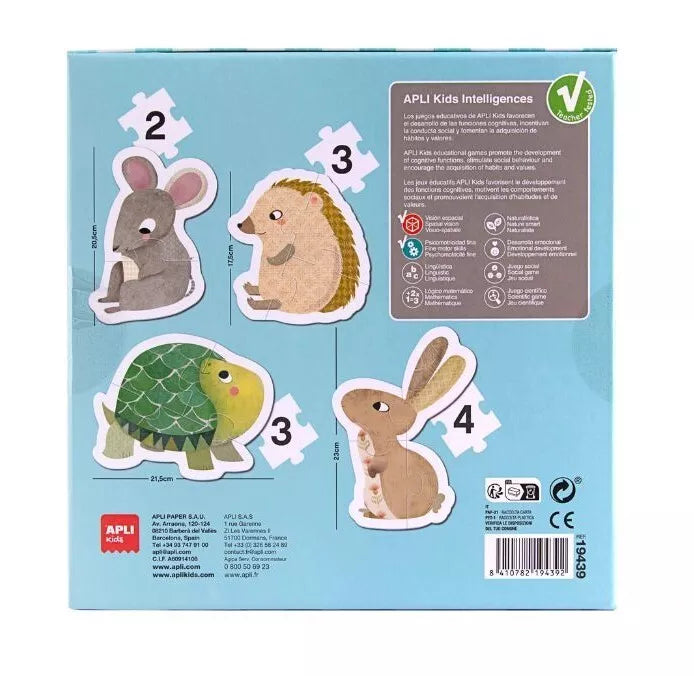 Rinkinyje rasite 12 didelių, lengvai suimamų detalių, kurios leidžia sukurti 4 skirtingas dėliones – peliuko, vėžlio, ežio ir triušio formos gyvūnus. Dėlionės yra specialiai pritaikytos mažiesiems – jų dalys yra puikiai užbaigtos, todėl jas lengva laikyti ir saugu naudoti.