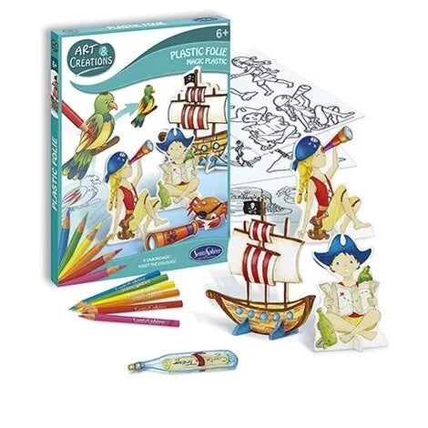 Atraskite susitraukiančio plastiko magiją ir suteikite šiems mieliems piratams gyvybės. Tiesiog nuspalvinkite rinkinyje esančias iliustracijas prieš įdėdami jas į karšta orkaitę. Gavę karščio paveikslėliai susitrauks septynis kartus ir taps dar ryškesni, tai bent stebuklas! Rinkinyje taip pat rasite stovelius, kurie leis Jūsų sukurtiems piratams stovėti tiesiai. Matmenys: 28 x 20.8 x 1.5 cm