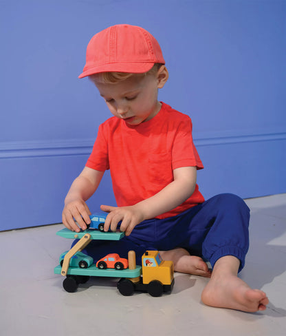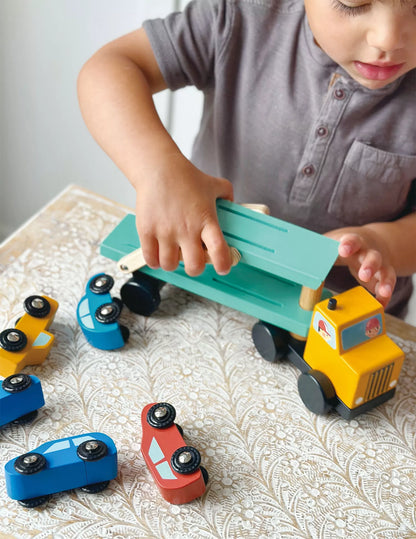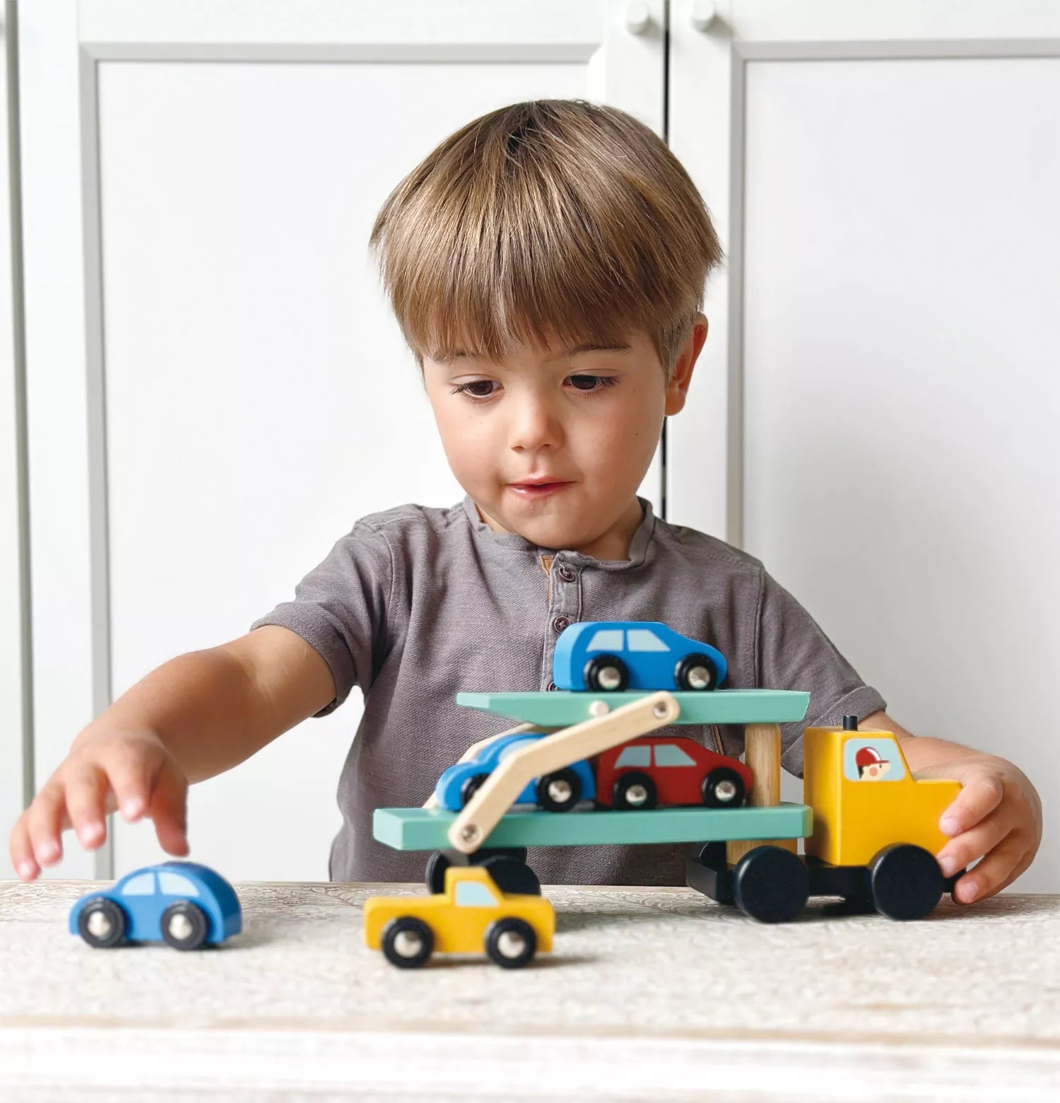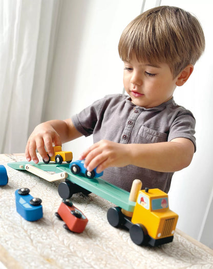 Šiame rinkinyje rasite autovežį ir 3 jo vežamus spalvotus automibilius. Viršutinis transporto priemonės aukštas gali būti tiek nuleistas, tiek pakeltas.
