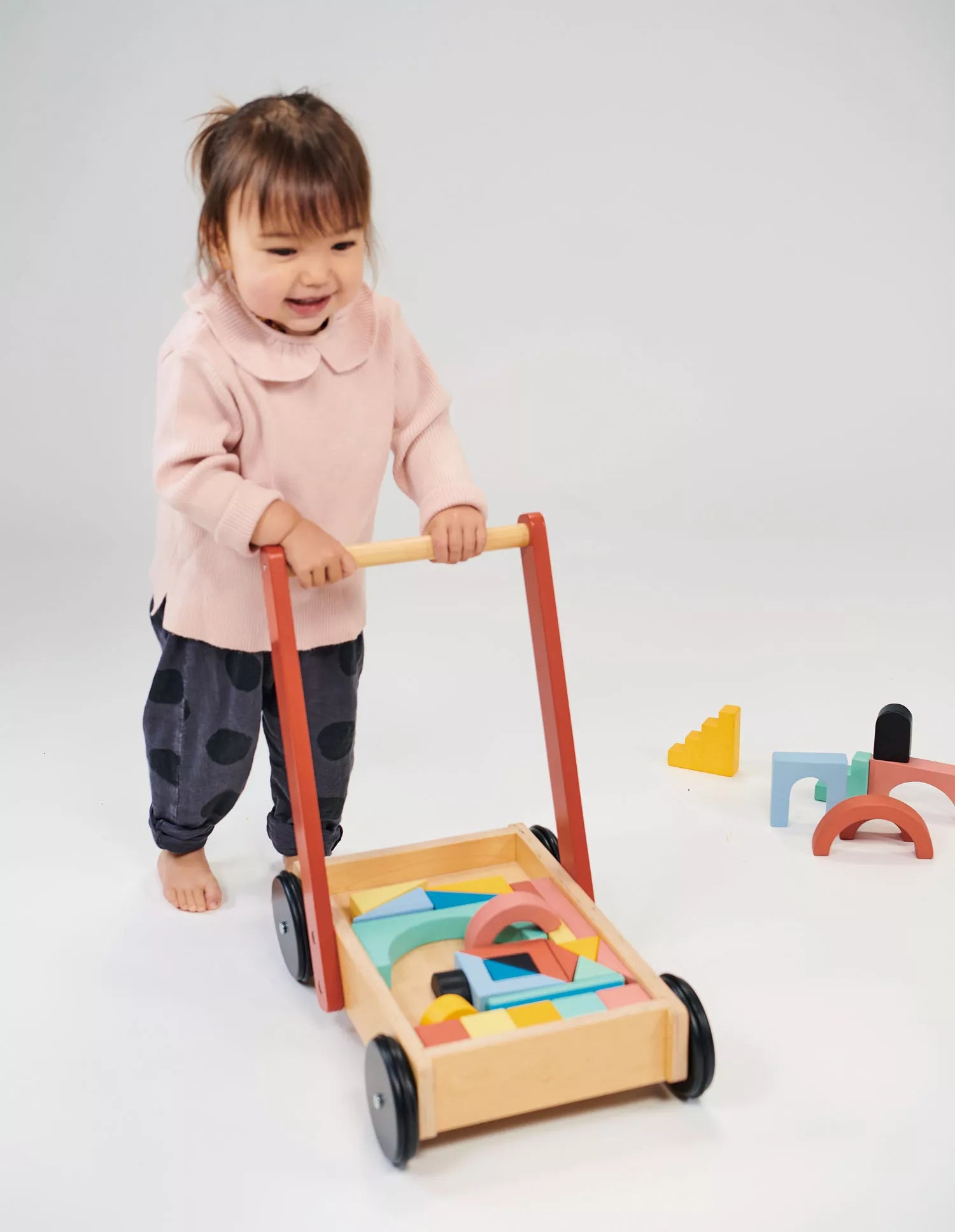 Tai vežimukas su spalvotomis medinėmis kaladėlėmis. Vežimėlis turi rankenėlę, su kuria galima tiek stumti, tiek traukti vežimėlį.