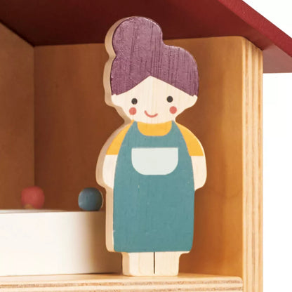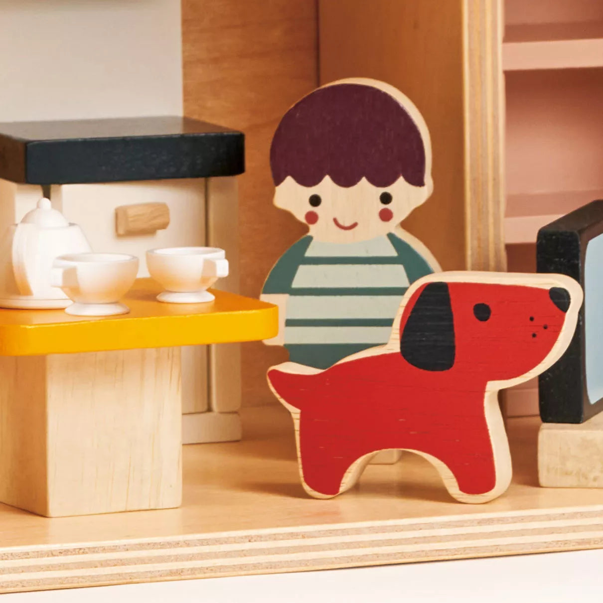 5 medinių figūrėlių - lėlyčių rinkinys: mama, tėtis, du vaikai ir šuniukas.