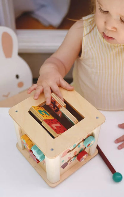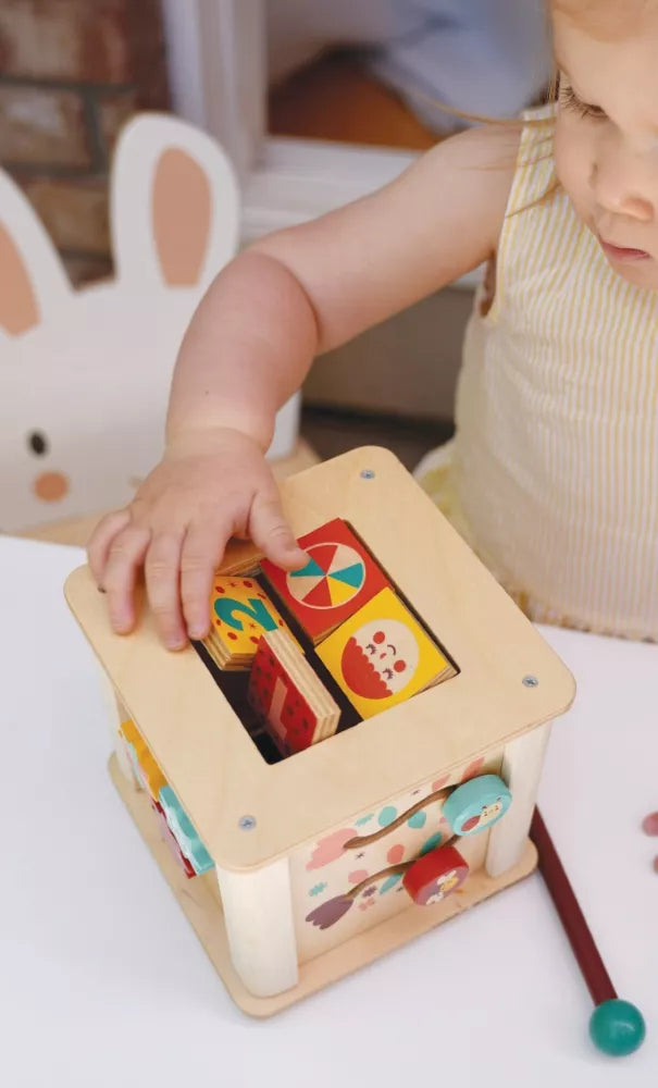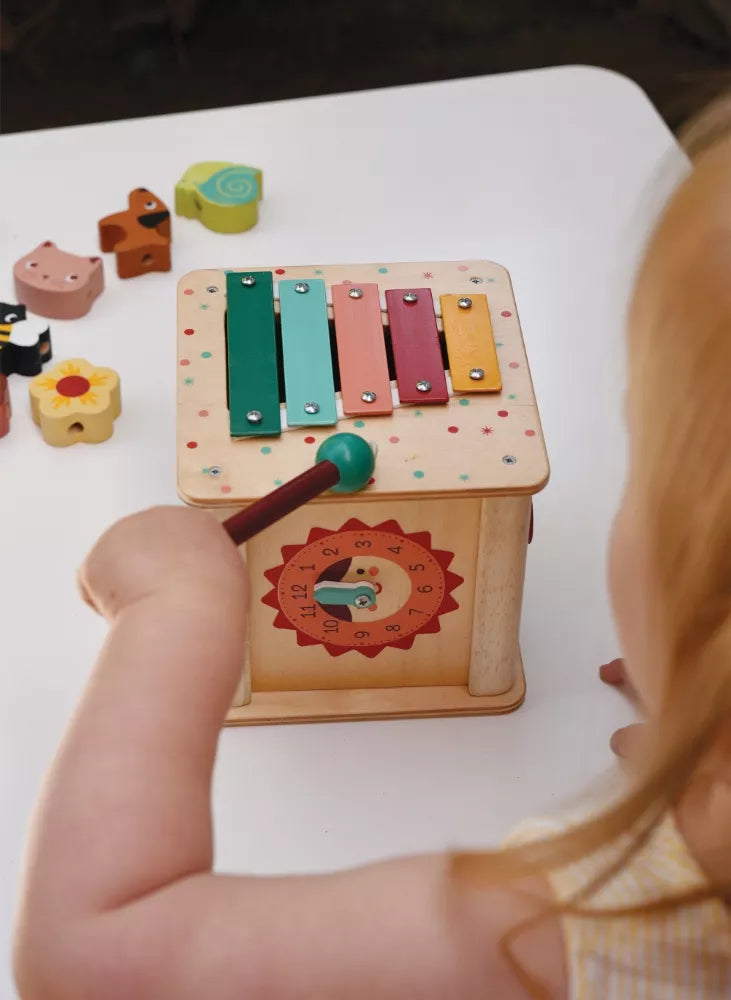 6 skirtingos pusės, su skirtingomis veiklomis. Metalofonas su kūjeliu, krumpliaračiai, besisukančios formos, durelės slepiančios paveikslėlį, laikrodukas, 4 nedidelės besisukančios plokštelės.