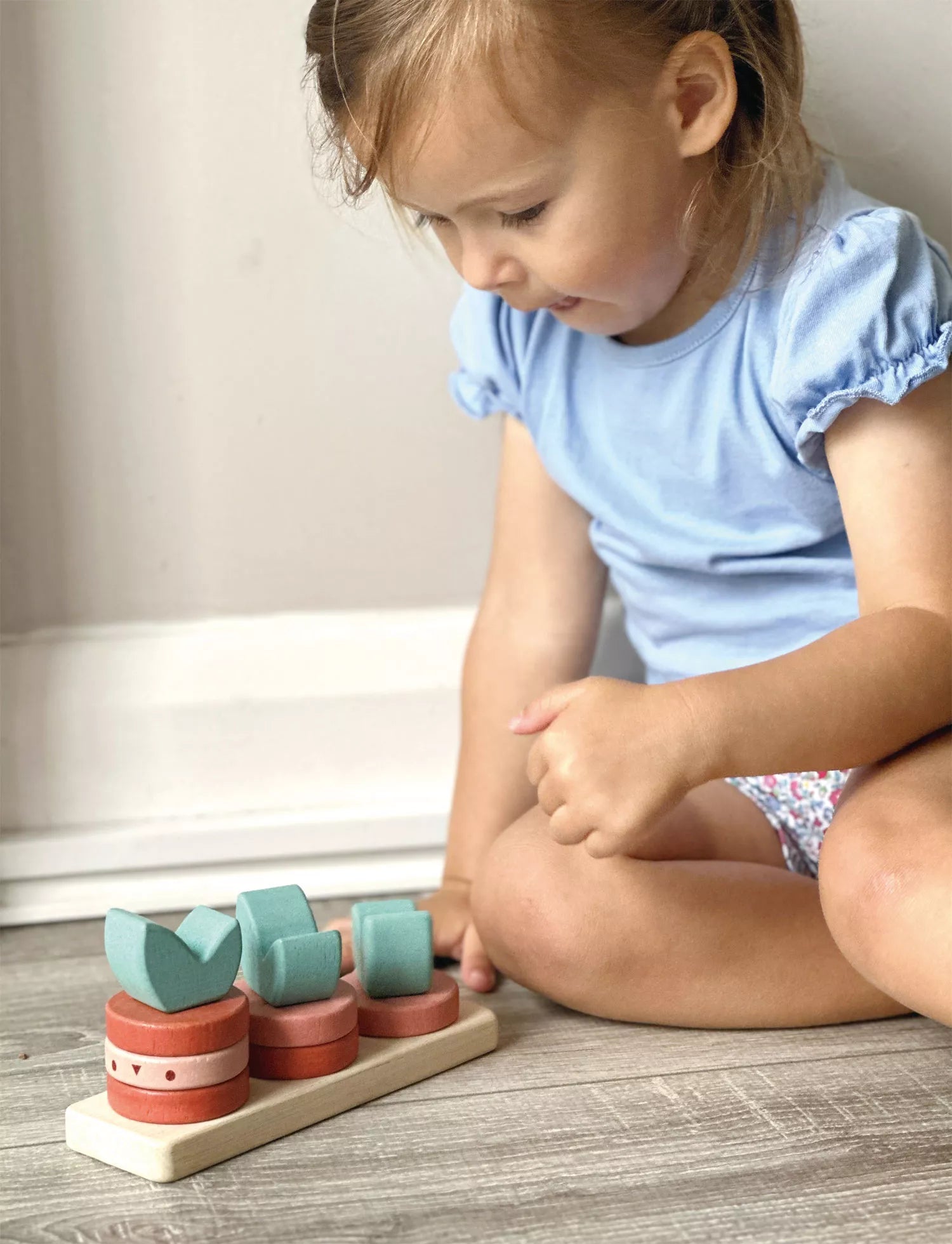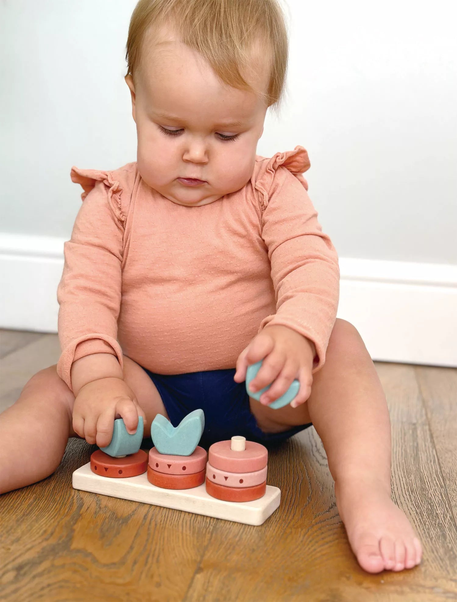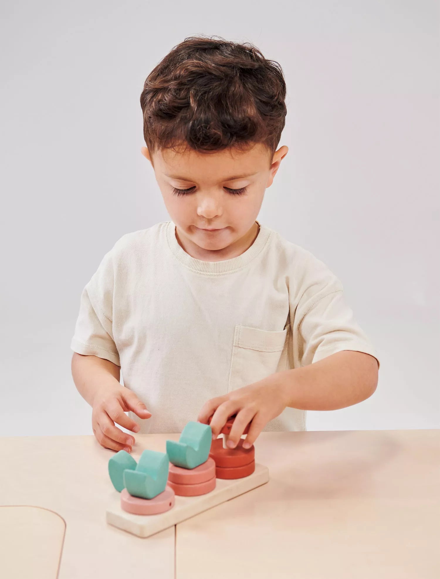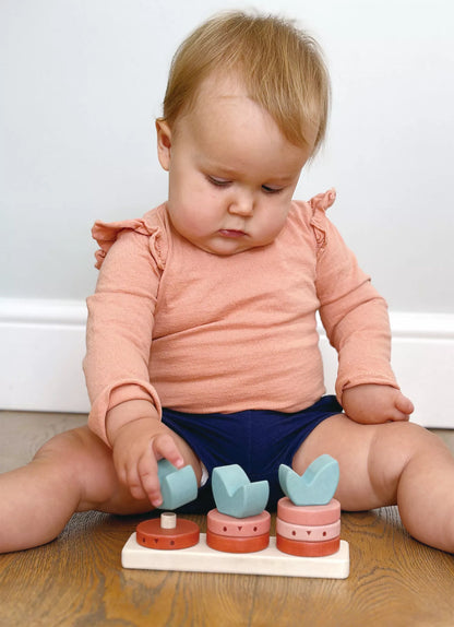 Rūšiavimo žaislas iš 10 detalių: pagrindukas, 6 skaičiavimo žiedai bei 3 viršūnėlės - lapai.