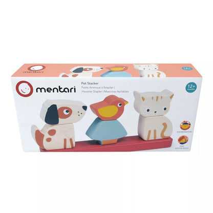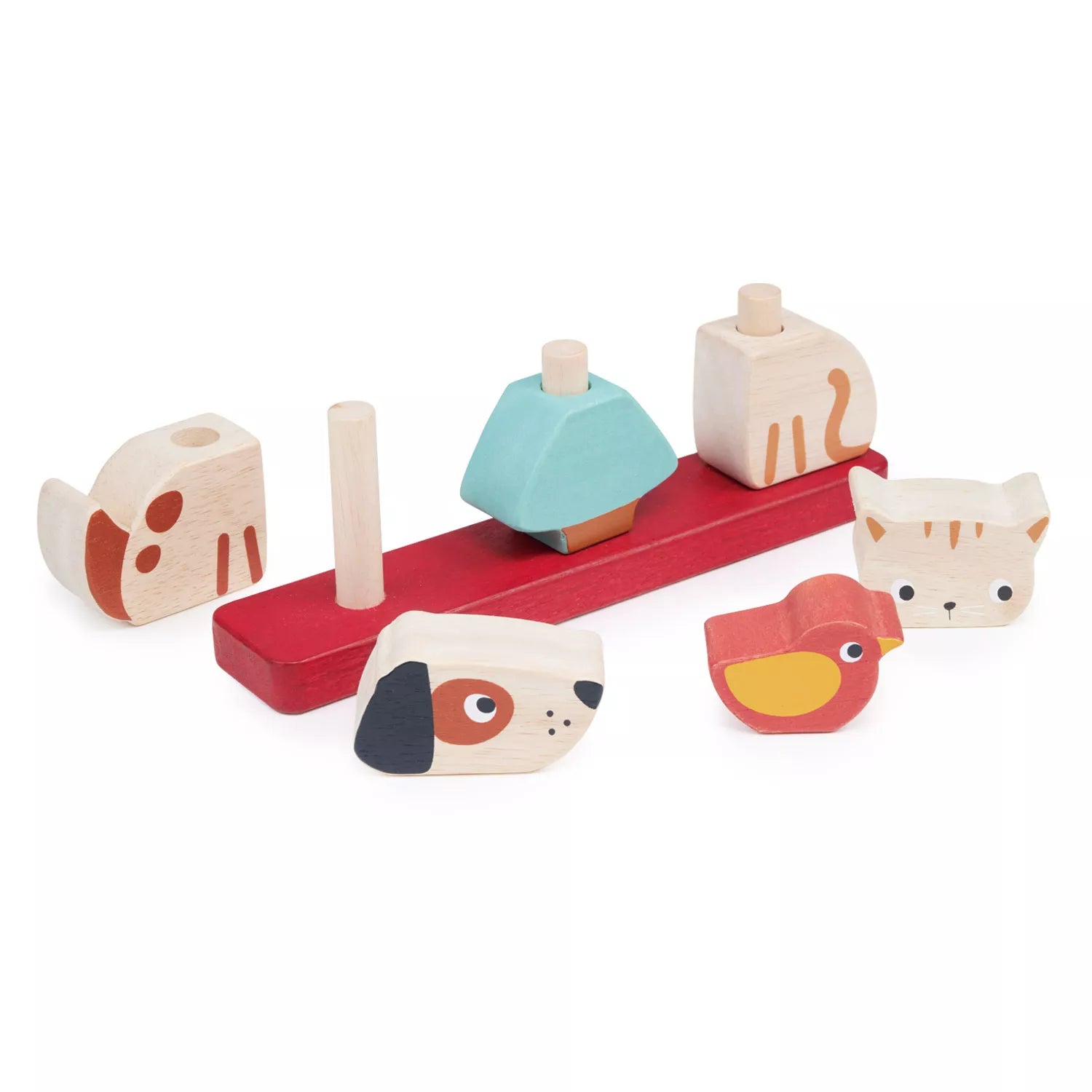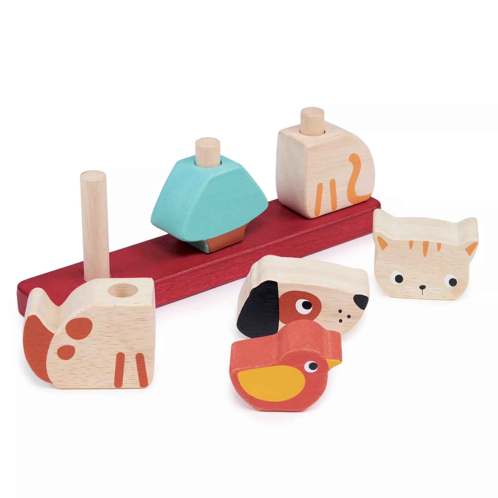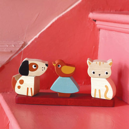 Iš 7 detalių susidedantis rinkinys: pagrindukas, šuniukas ir kačiukas susidedantys iš dviejų dalių, paukščiukas bei medis.