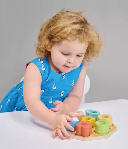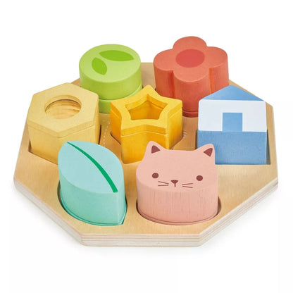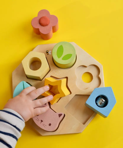 Kiekviena forma turi skirtingą garsą ar tekstūrą. Galima paspausti gėlytės centriuką, žiūrėti pro šešiakampio centre esančią kaleidoskopinę prizmę, sukinėti žalią cilindrą, skambinti namelio varpeliu, kratyti lapelio viduje esančius karoliukus, glostyti katinėlio kailiuką, pažvelgti per spalvotą lęšį žvaigždutės centre.