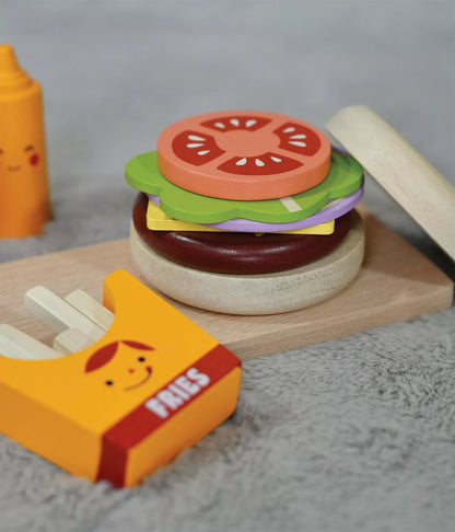 Rinkinyje žaislinis sumuštinis pagamintas iš 5 skirtingų dalių, 2 padažų buteliukai ir 5 bulvytės fri specialioje dėžutėje.