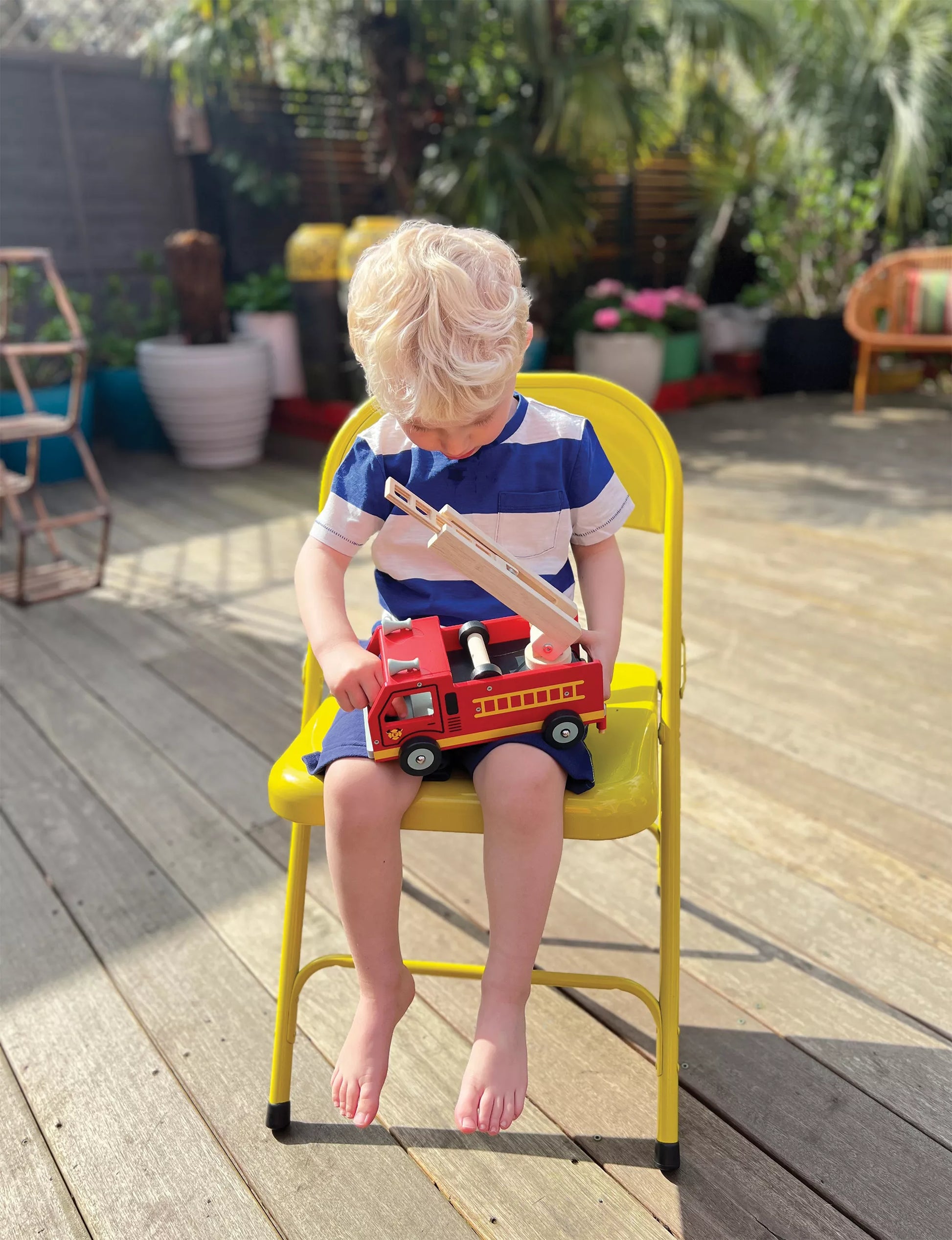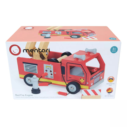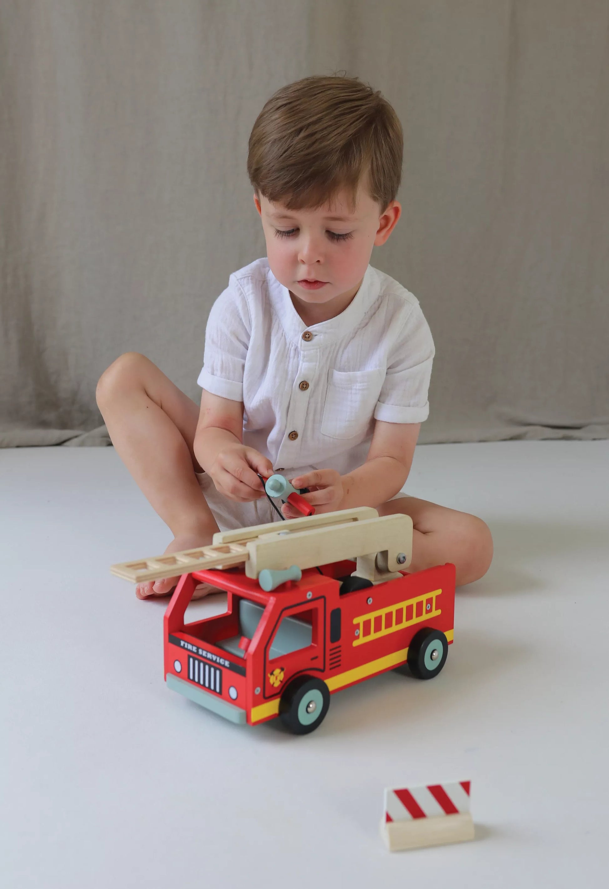 Šio medinio ugniagesių automobilio kopėčios sukinėjasi ir gali būti pailginamos, žarna susivynioja. Rinkinyje taip pat rasite kelio užtvarą, hidrantą ir papildomą žarną, kuri gali sujungti hidrantą ir ugniagesių automobilį.
