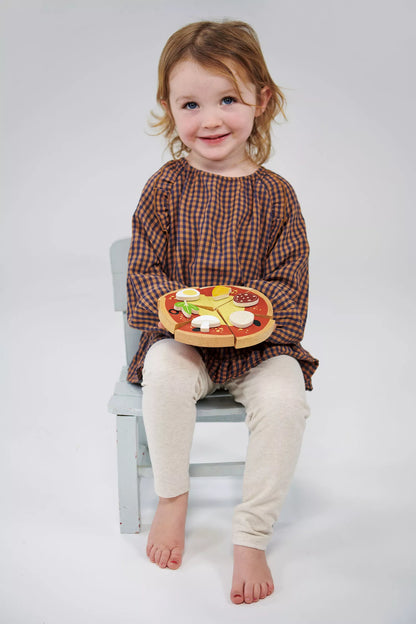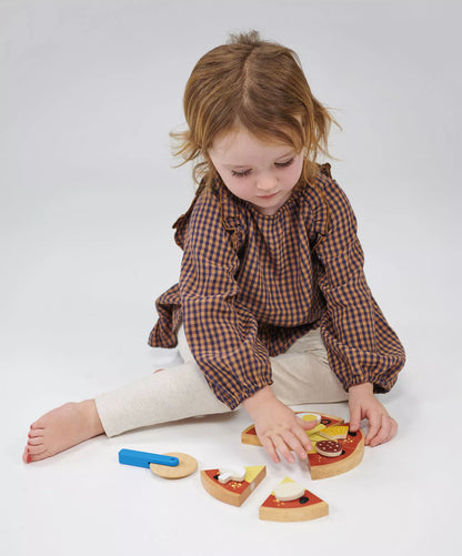 Rinkinyje yra: 6 picos gabaliukai, žaislinė pjaustyklė, 6 picos priedai.