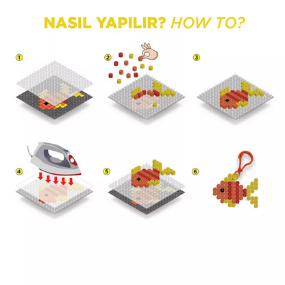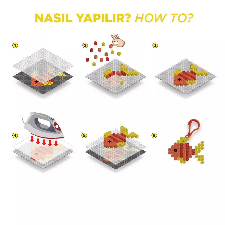- Su suaugusio priežiūra ir pagalba su lygintuvu sukamuoju judesiu užlyginti karoliukus. Nelaikyti lygintuvo ilgai uždėjus vienoje vietoje.