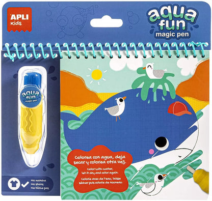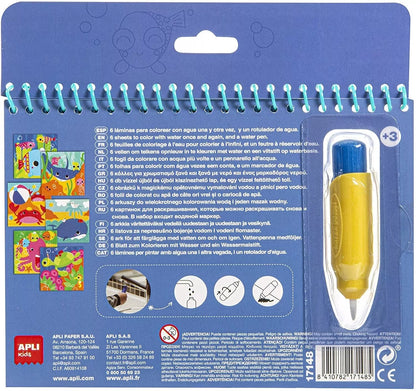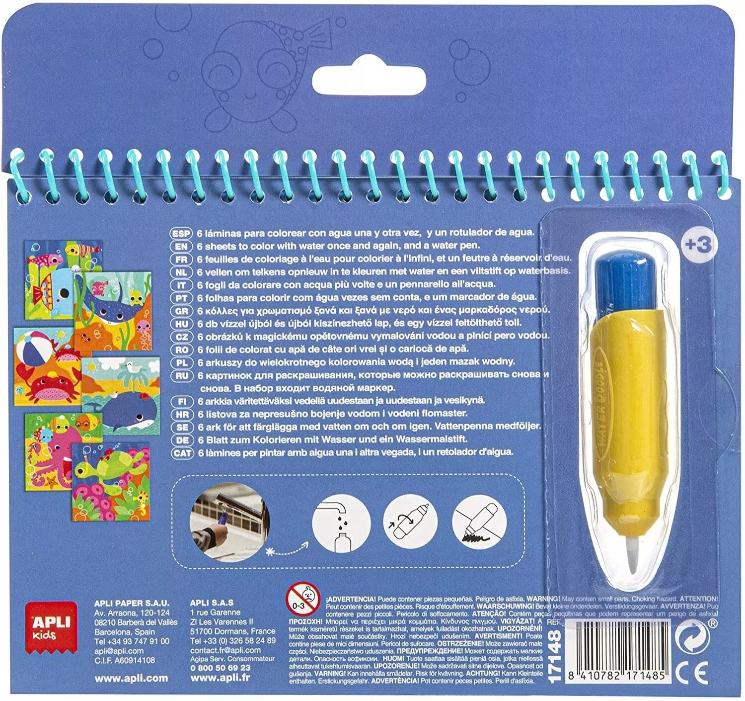 Tai - vandenyno tematikos bloknotas spalvinimui su specialiu vandeniu pripildomu pieštuku. Kiekvieną bloknotą sudaro 6 lapai su piešiniais ir pieštukas, kurį galima pripildyti vandeniu. Piešiniai ant lapų yra atspausdinti juodai baltu stiliumi, o nuspalvinus baltas vietas vandeniniu pieštuku, išryškėja gražiausios spalvos. Paveikslėliui išdžiuvus jis vėl tampa juodai baltu, todėl vaikai gali dar kartą pasinerti į kūrybinį procesą ir taip be pabaigos spalvinti neišsitepant rankelių, tiesiog pripildant pieštuką vandeniu. Kompaktiškas formatas idealiai tinka pasiimti bloknotą bet kur su savimi ir suteikti vaikams galimybę džiaugtis spalvinimu. Taip pat šis kūrybinis rinkinys pasižymi aukšta didaktine verte - jis palaiko kūrybinių gebėjimų, tokių kaip tapymas ar dekoravimas, vystymąsi, stimuliuoja smulkiosios motorikos ir ankstyvojo rašymo įgūdžius, skatina koncentraciją bei padeda vaikams vystyti pasitikėjimą savimi.