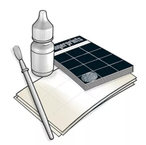 - naudokite juodus miltelius pirštų atspaudams išryškinti ant paviršių, tada nuimkite ir išsaugokite atspaudus naudodami pridėtus skaidrius lipdukus;