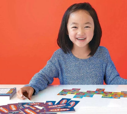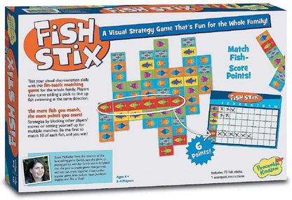 Derinkite žuvytes ir rinkite taškus! Skirtingo amžiaus žaidėjai gali žaisti visi drauge. Kiekvienas žaidėjas stengiasi surinkti dešimt kiekvienos rūšies žuvelės taškų, kurie gaunami padedant savo žuvų korteles taip, jog jos derėtų su jau padėtomis žuvelėmis. Paeiliui dėliokite ir derinkite korteles ir skaičiuokite žuveles. Spalvų derinimas ir žuvelių skaičiavimas yra smagus būdas mokyti vaikus strateguoti bei pažinti spalvas ir skaičius. „Fish Stix” - tai vizualinės strategijos žaidimas, kurį išmoksite per kelias sekundes ir kaskart žaisdami patirsite žaidimą vis naujai.