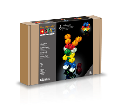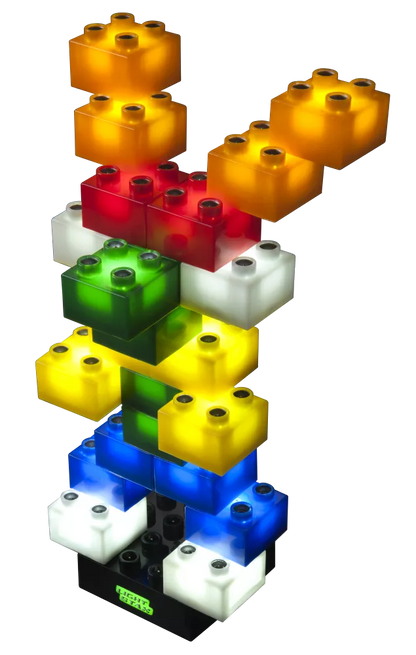 24 šviečiančios 2x2 STAX kaladėlės (mėlynos - 4 vnt., žalios - 4 vnt., geltonos - 4 vnt., oranžinės - 4 vnt., raudonos - 4 vnt., baltos - 4 vnt.)