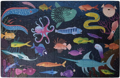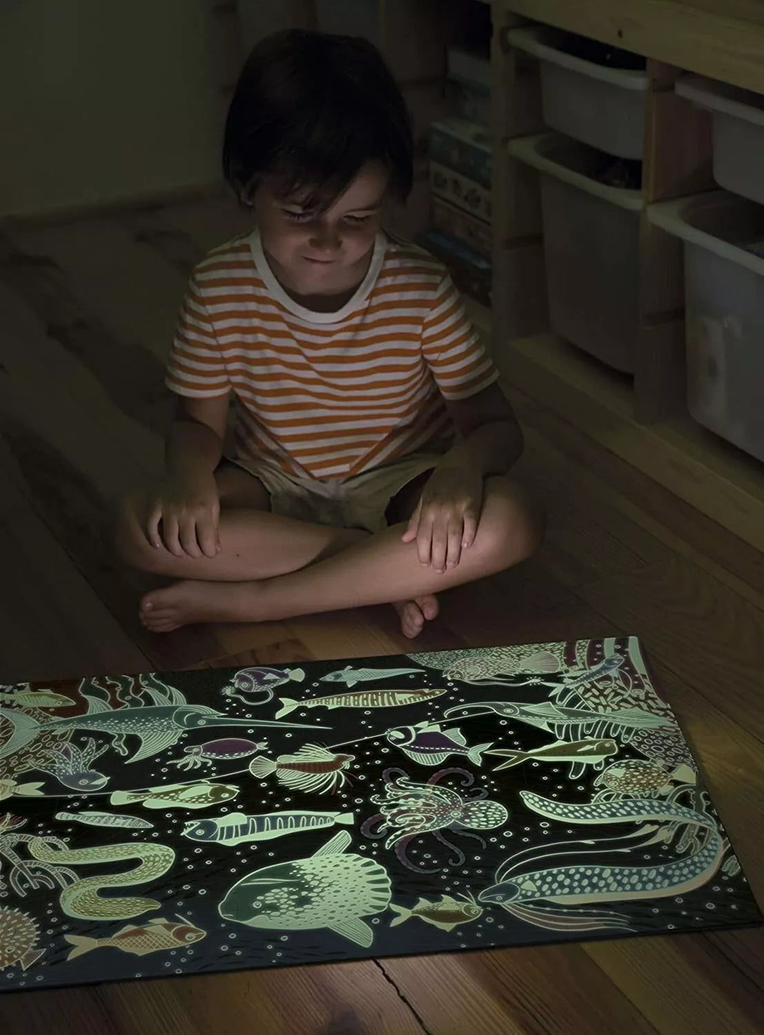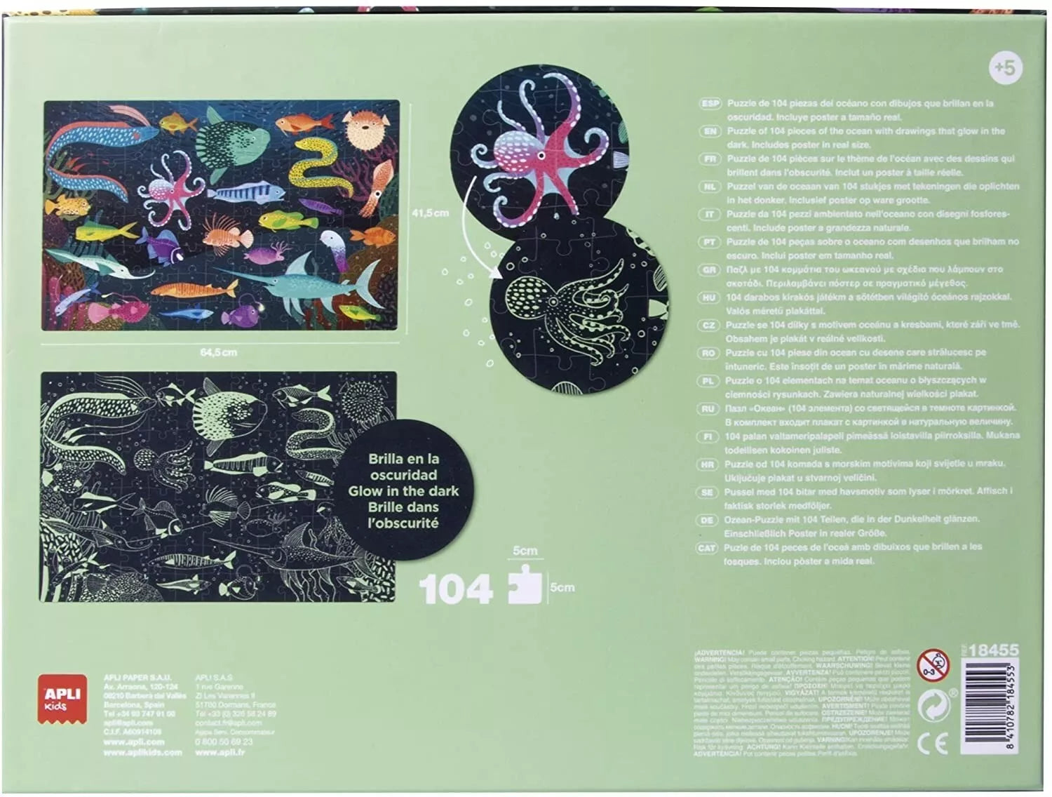 Ši fluorescentinė dėlionė - tai tamsoje šviečiantis vandenyno modelis, sudarytas iš 104 detalių. Rinkinyje taip pat yra realaus dydžio, dėlionę atitinkantis plakatas, palengvinantis statymą. Sudėję dėlionę, vaikai gali išjungti šviesas ir pamatyti tamsoje šviečiančias žuveles bei atrasti šviesoje ir tamsoje egzistuojančius dėlionės skirtumus. Išskirtinis APLI Kids dizainas - vaikiškas, spalvingas, aiškus ir paprastas bei lengvai paimamos ir saugios detalės. Dėlionės - ne tik smagus laiko praleidimo būdas, bet ir puiki priemonė gerinanti ir vystanti daugybę įgūdžių: koncentraciją, pastabumą, atmintį, problemų sprendimą, vizualinį suvokimą, smulkiąją motoriką, formų pažinimą, akių-rankų koordinaciją ir matematinius gebėjimus. O sėkmingai užbaigta dėlionė suteikia pasitikėjimo savimi ir vidinės motyvacijos.