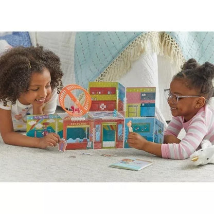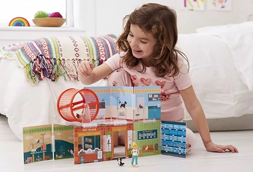Kviečiami visi gyvūnėlių mylėtojai ir mylėtojos! Su Wonderhood rinkiniu "Pet Place" vaikai gali sukurti tikrą naminių gyvūnėlių rojų, kuriame yra ir gyvūnėlių priežiūros, ir šukavimo centrai, veterinarijos klinika, gyvūnų prekių parduotuvė su veikiančiu treniravimosi ratu bei daugybė kitų smagių vietelių. 12 nuostabiai iliustruotų scenų, atspausdintų ant dvipusių, blizgaus plastiko skydelių, gali būti sudedamos pačiomis įvairiausiomis kombinacijomis: tiesiog sujunkite scenas kartu naudodamiesi patvariomis plastikinėmis jungtimis. Kiekvienas Wonderhood rinkinys atkeliauja kartu su veiklų žurnalu, pripildytu istorijų ir smagiais architektūriniais iššūkiais, kviečiančiais vaikus išbandyti savo problemų sprendimo gebėjimus. Sujungę šį rinkinį su kitais Wonderhood rinkiniais, galėsite sukurti visą miestą! Baigę statyti galėsite žaisti valandų valandas, o tuomet viską išardyti ir kitą kartą sukurti visai kitokį architektūrinį šedevrą.